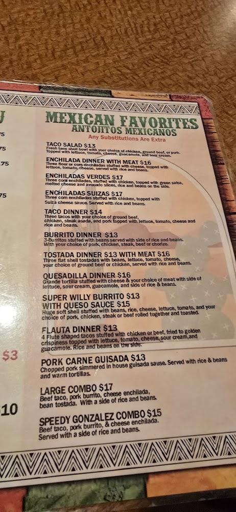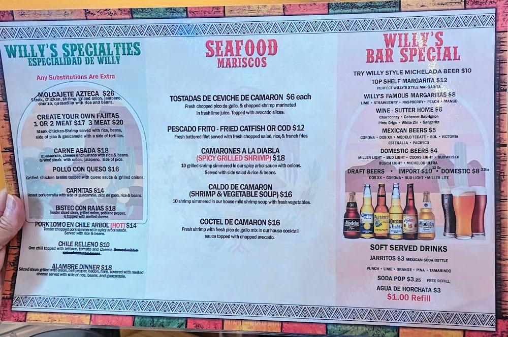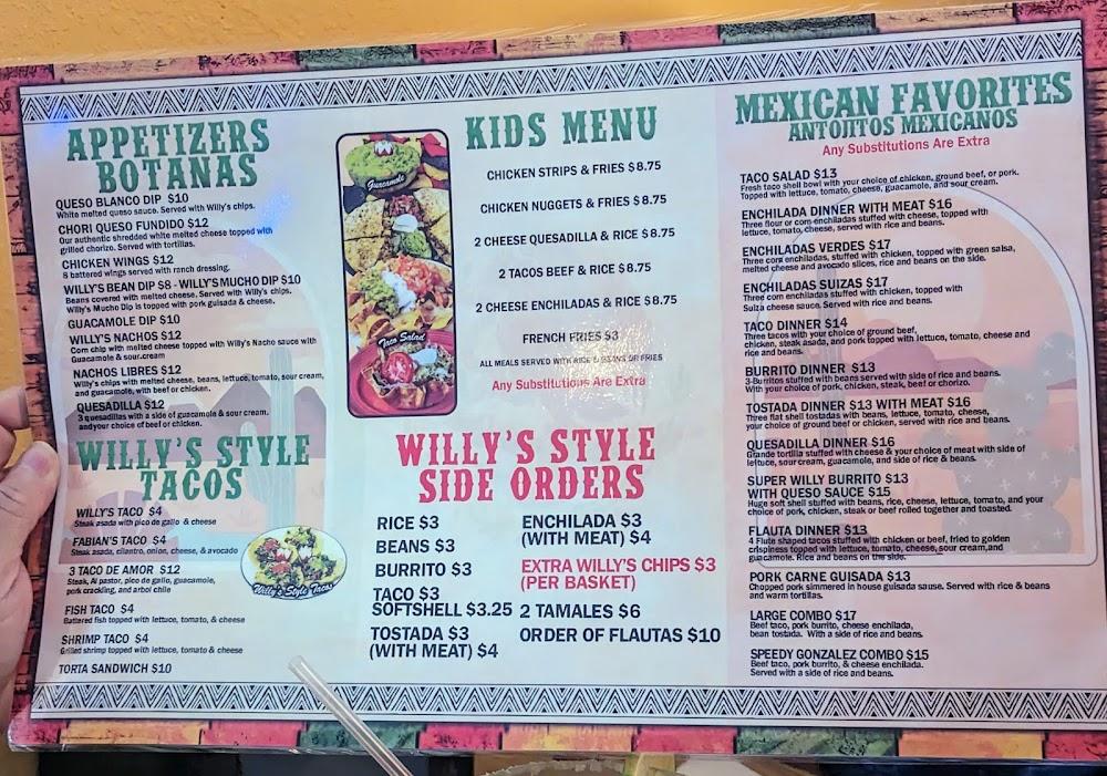 The menu at Willy's Restaurant boasts a wide variety of Mexican dishes. Tacos come in several styles, including shrimp and fish options. Appetizers feature classic delights like guacamole and nachos. Signature dishes like the Super Willy Burrito provide hearty meals that satisfy. Kids will also find a dedicated menu, making it family-friendly. Prices remain wallet-friendly, averaging around $10. A selection of beverages, including local beers and refreshing horchata, complements meals.